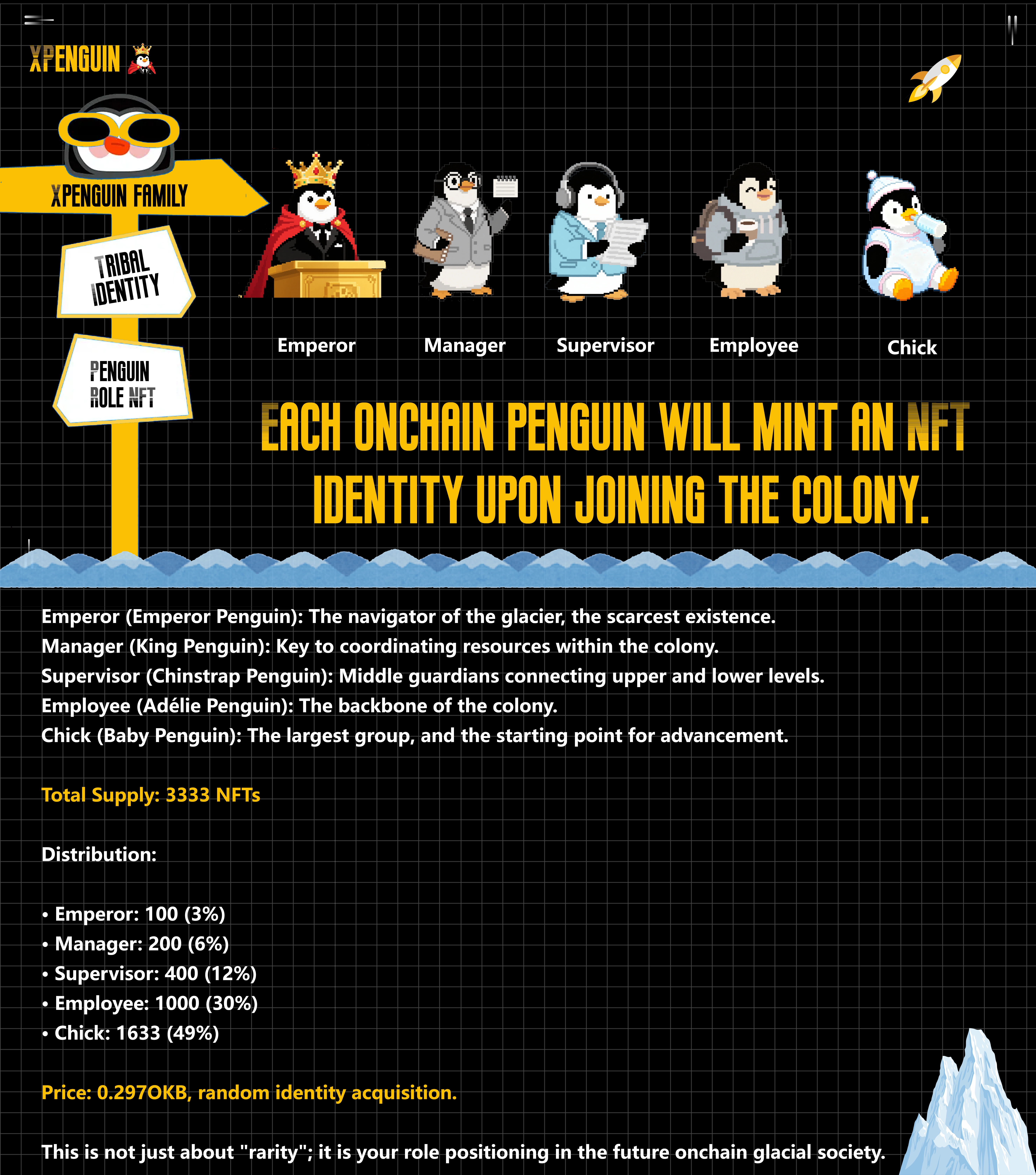 In the near future, the real world and the onchain world will merge completely, like glaciers and oceans. An individual's identity, collaboration, and value of existence will be permanently frozen and recorded on the chain. In this new world, an individual's existence is no longer dependent on traditional identifiers but is defined by an onchain penguin identity. You are not just holding an NFT; you are becoming an Tundra Character Unit. You are no longer an ordinary Web3 user, but a Soul Penguin, composed of different "Tribe Segments". And at the heart of this icy transformation stands an unprecedented iceberg: